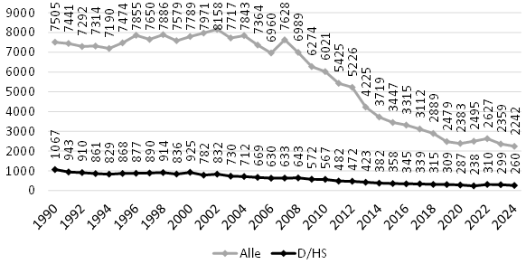 Figur 4.16.1: Utvikling over tid av det totale antall skadde og drepte («Alle») og av antall drepte og hardt skadde («D/HS») i personbiler i Norge, 1990-2024, basert på offisiell ulykkesstatistikk (trine.atlas.vegvesen.no).