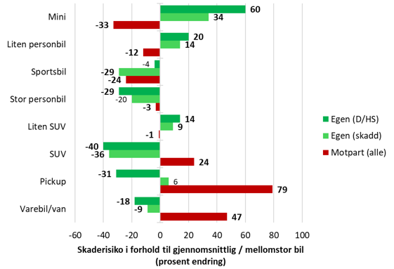 Type bil: I større biler er skaderisikoen i gjennomsnitt lavere enn i mindre biler, dvs. at skaderisikoen er høyest i de minste personbilene, lavere i større personbiler og varebiler, og lavest i SUVer og pickuper. Resultatene tyder på at dette ikke kan forklares med vektforskjeller.