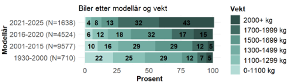 Figur 4.19.1: Vektfordeling blant biler (personbil, SUV, pickup) fra ulike registreringsår som var innblandet i personskadeulykker i Norge, 2020-2024 (basert på detaljert ulykkesstatistikk fra Statens vegvesen, TRULS).