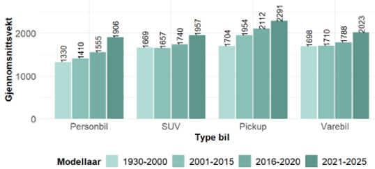 Bilenes vekt og personskadeulykker i Norge: I Norge har personbilenes vekt over tid. Fra 2001 til 2016, har gjennomsnittsvekten i hele bilbestanden økt fra 1128 til 1409 kg, og andelen nye biler som veier over 1400 kg har økt fra 32 til 64 prosent (Fridstrøm og Østli, 2016).