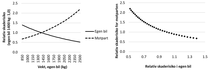 Diagrammet til venstre viser at når vekten på den aktuelle bilen øker, er risikoøkningen hos motparten større enn risikonedgangen i den aktuelle bilen er. Det kan tyde på at den samlede skaderisikoen vil øke. Resultatene er imidlertid basert på trendfunksjoner som er basert på uvektede gjennomsnitt for ulike typer bil, og ikke på studier som har undersøkt sammenhengen med den faktiske samlede skaderisikoen. I tillegg vil den samlede risikoen også avhenge av andre faktorer enn bilenes vekt, som bl.a. geometriske forskjeller mellom bilene (se kapittel 4.22).