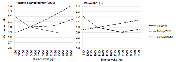 Type kjøretøy: Resultatene tyder på at vekten til SUVer og pickuper har større betydning for motpartens skaderisiko enn vekten på personbiler. Monfort (2025) fant den største virkningen av bilenes vekt på motpartens skaderisiko for pickuper, en mindre virkning for SUVer og en enda mindre virkning for personbiler. Blant personbiler er virkningen større når bilen veier over 1,8 tonn enn når den veier mindre.
