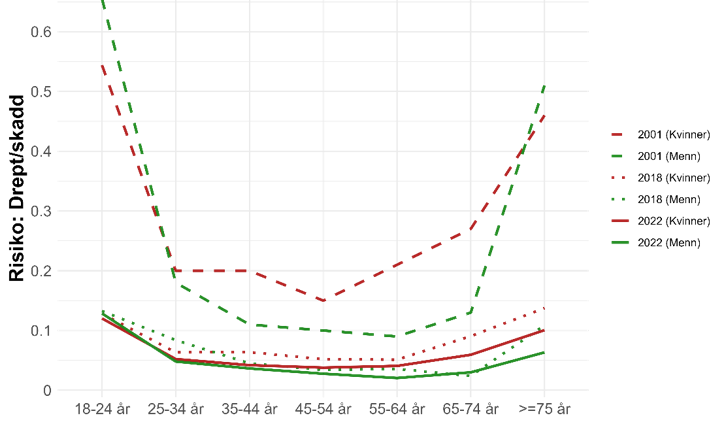 Figur 6.4.1 viser en markant nedgang fra den yngste til den nest-yngste aldersgruppen i 2001. I 2018 går risikoen fortsatt ned, men ikke lenger like mye. Det er en ytterligere liten nedgang fra 2018 til 2022. Over tid har risikoen blant unge førere gått betydelig ned. Fra 2001 til 2018 har risikoen for å bli skadd eller drept gått ned med 79% blant unge førere (og til sammenligning med 67% blant førere mellom 45 og 54 år). Fra 2018 til 2022 er risikoen igjen noe redusert, spesielt blant menn mellom 25 og 34 år, kvinner over 55 år og menn over 75 år. Imidlertid er det ingen forandring fra 2018 til 2022 i den yngste aldersgruppa.